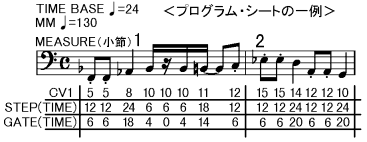 マイクロ・コンポーザー(以下MCと略す)では、各演奏データを数値に変換してプログラムするのですが、打ち込みの順序としては、CV(音程)、STEP(譜割り)、GATE(レガート、スタッカート等のニュアンス)で、この3つのデータは最低限必要なものと言えます。まずCVは、各音程に固有のナンバーを持たせ(C1=0,C#1=1、E1=4、C2=12、C3=24等々)これを打ち込みます。MC−4では、キーボードを押さえてCVをロードできるので、キーボードが弾ける人にはこちらのほうが容易でしょう。 譜面からMC打ち込み用のプログラム・シートを作成したら、まずこの音程だけを先にロードし、これが済んだ時点で次のSTEP、GATEに進みます。 STEP(TIME)、GATE(同)は両方ともリズムに関するものですが、STEPが表記上の音符の長さ(4分音符=24、8分音符=12、全休止符=96という具合に設定する)なのに対し、GATEは、オルガンで言うと鍵盤を押している時間の長さ、つまりレガート、スタッカート、スラー等のニュアンスを決定することになります(実際には、シンセサイザーのEGのGATEをどのくらい開くかをコントロールしているわけです)。 したがってGATEの設置は、STEPより小さくなり、GATEがゼロの時は休符ということになります。 ここにあげた図は、譜面(ベース・ラインの一例)をもとに、プログラム・シートを作成するためのものです。1小節目の3,4拍子のタイで結ばれた部分は、1つの音符として数える点や、GATEでスタッカートのニュアンスを出している点に注目してください。さらに、ダイナミックスもCVに30〜100の数値を打ち込み、各音符ごとに変化を付けられるし(VCAに送る)、音色の微妙な変化も可能です(VCFに送る)。 さて、多重録音時の重要な要素としてシンクロ機能があります。これは、テープデッキのあるトラックにMCの出す同期信号を同時録音しておき、後でMCに戻すことでMCを駆動し、完全な同期自動演奏が可能になります。 これにより、全く同じテンポで声部をどんどん増やしていけるわけです。